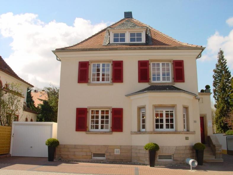 Holz Sprossenfenster aus eigener Fertigung mit roten Klappläden und roter Holz Haustür